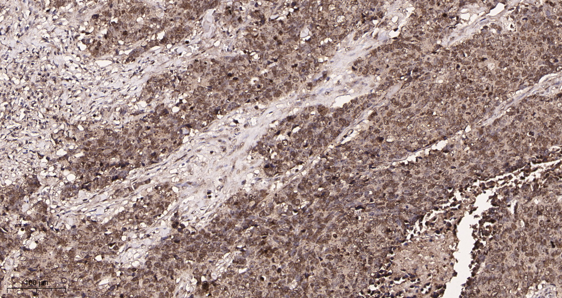 Immunohistochemical analysis of paraffin-embedded Human lung carcinoma tissue. 1, primary Antibody was diluted at 1:200(4℃,overnight). 2, EDTA pH 9.0 was used for antibody retrieval(>98℃,20min). 3,Secondary antibody was diluted at 1:200(room tempeRature, 30min).