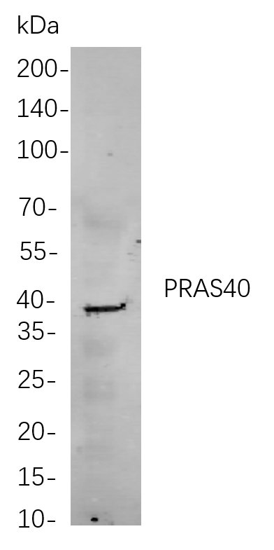Western blot analysis of lysates from A549 cells, using PRAS40 Rabbit mAb. The HRP-conjugated Goat anti-Rabbit IgG antibody was used to detect the antibody.