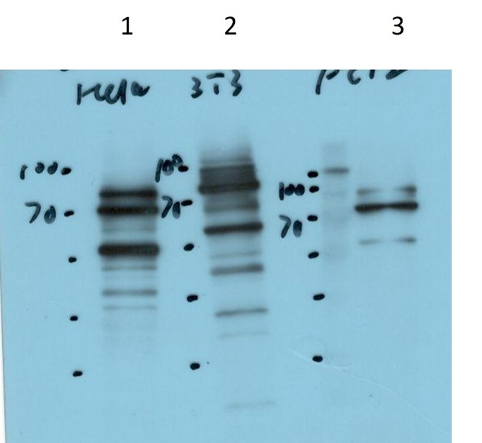 Western blot analysis of 1)293T Cell, 2) 3T3 Cell, 3) PC12 Cell Lysate using STIM1(TDY1123)Rabbit Polyclonal Antibody diluted at 1:2,000.