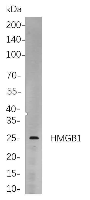 Western blot analysis of lysates from Hela cells, using HMGB1 Rabbit mAb. The HRP-conjugated Goat anti-Rabbit IgG antibody was used to detect the antibody.