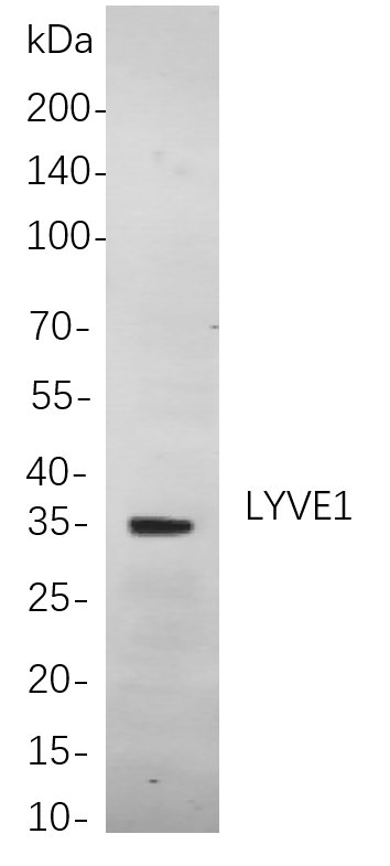 Western blot analysis of lysates from Rat lung cells, using LYVE1 Rabbit mAb. The HRP-conjugated Goat anti-Rabbit IgG antibody was used to detect the antibody.